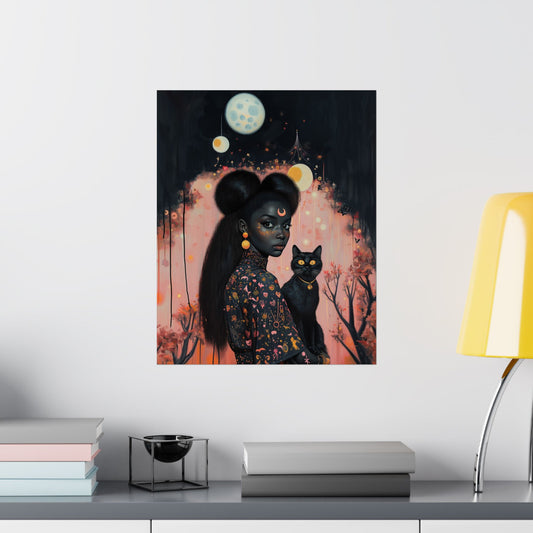 Black Witch & Black Cat Poster | Sakura Moon | Art Print for Kids Room