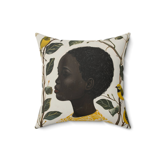 Black Woman, Yellow Bird & Flowers Art | Square Pillow with Zipper | 4 sizes