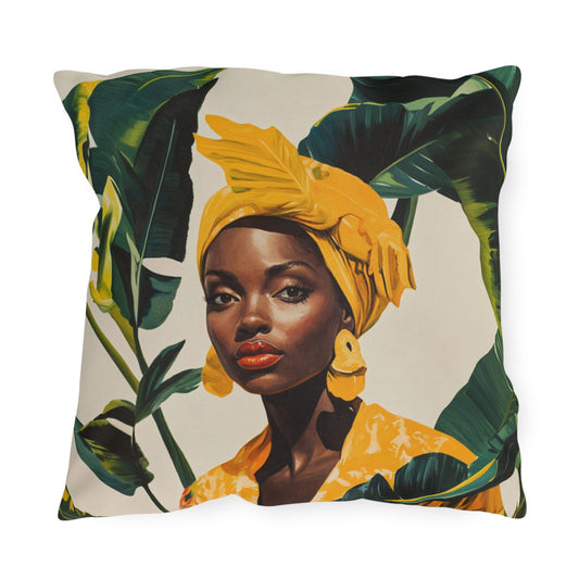 Black Woman in Yellow Headwrap & Dress, Outdoor Pillow, 3 sizes