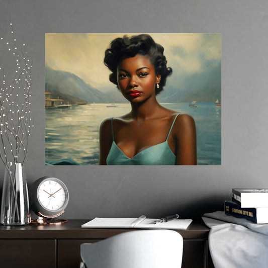 Elegant Black Women in Mediterranean, Teal Dress Poster – Retro Style Art