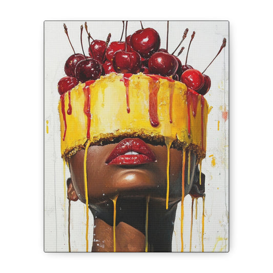 Whimsical Cherry Cake Canvas Art Print – Joyful Black Woman Portrait