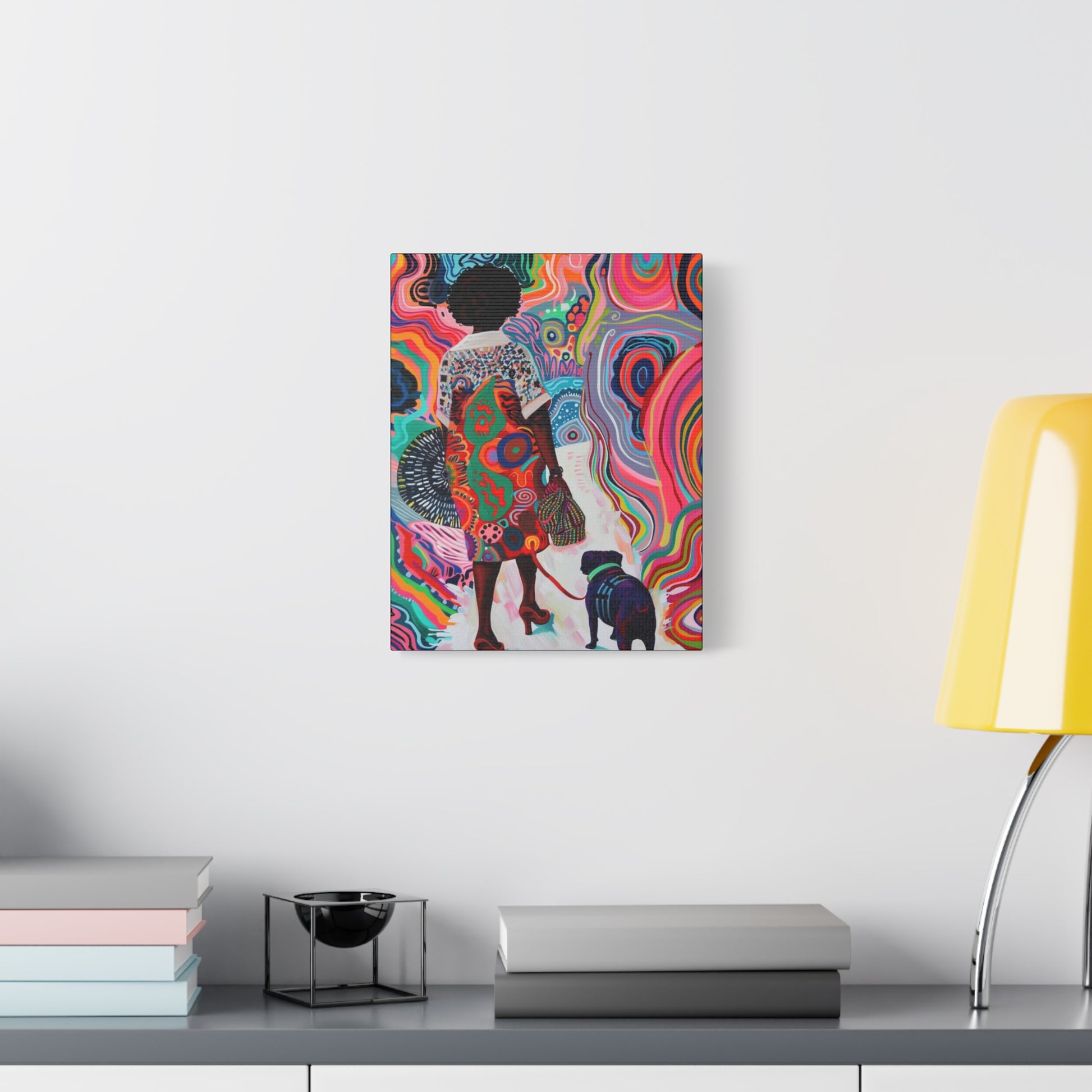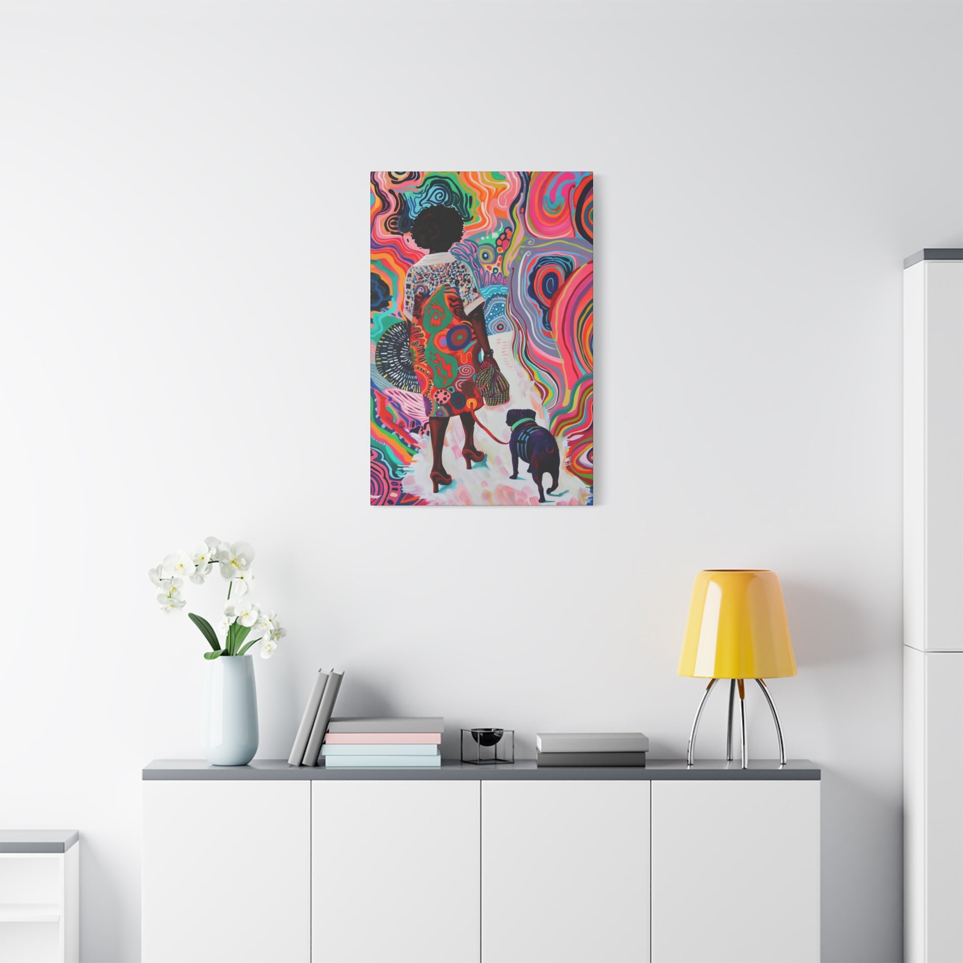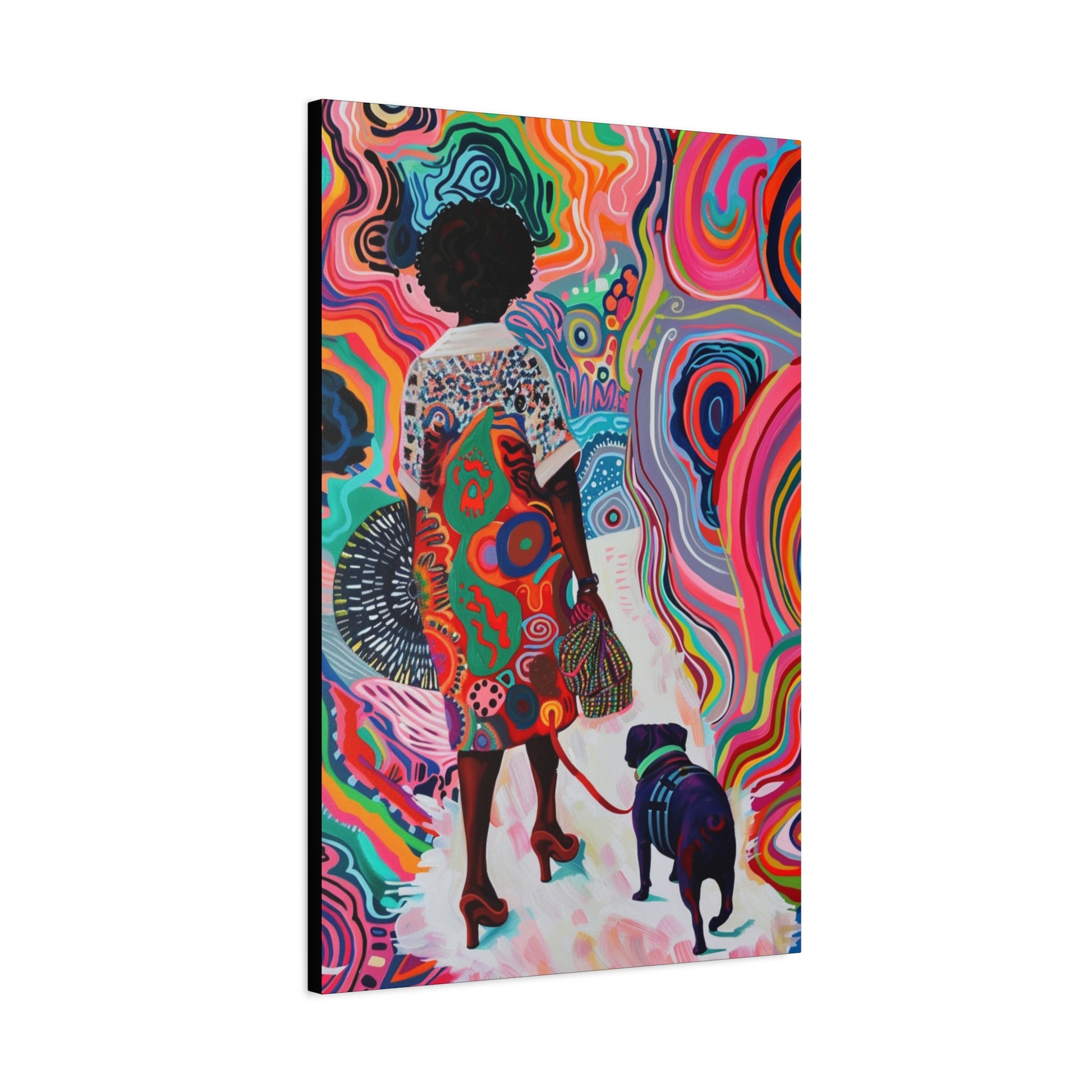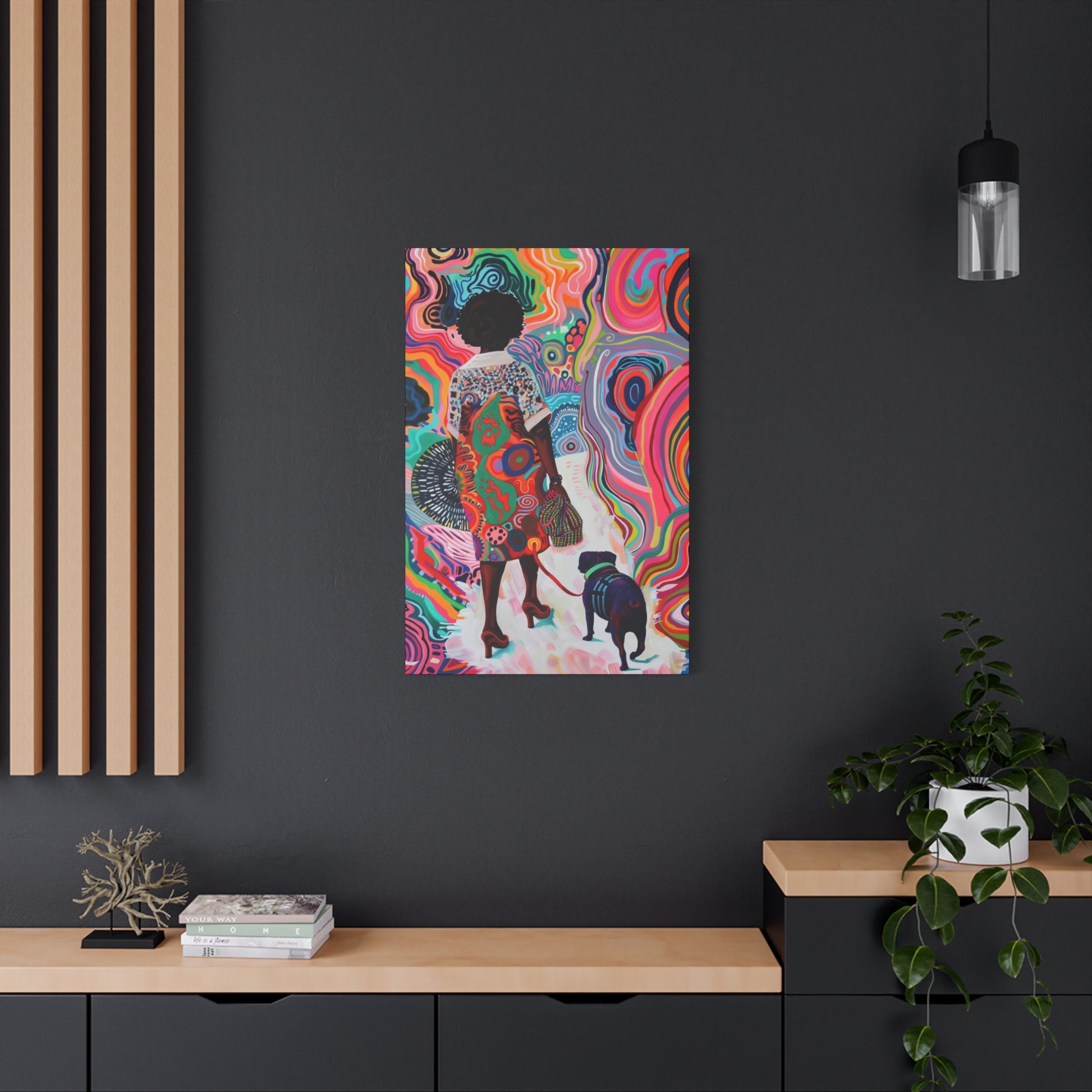 Experience an explosion of color with this trippy 1970s-inspired canvas, featuring a woman walking her dog in an ethereal world. Inspired by Nina Simone's "Funkier Than a Mosquito's Tweeter", this beautiful canvas is sure to add a unique touch to any space