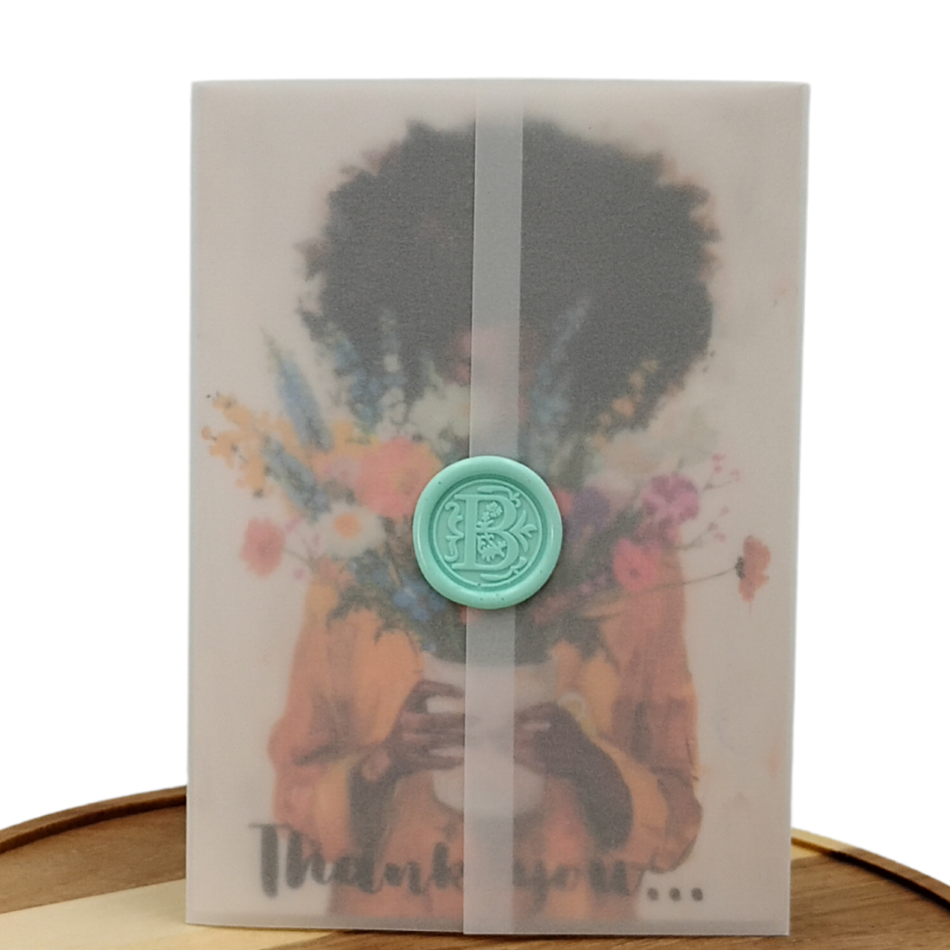 Have something you want to say? Say it with us. This card feature's 3 prints: the outside, inside and back. Front cover says, "Thank You", Inner Print says, "For nurturing me" with flowers on the top and bottom border and space to print. Back cover is graphic print and company logo.