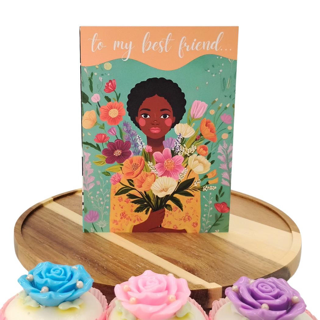 Show your best friend how much they mean to you with this beautiful and heartfelt greeting card. Featuring a vibrant illustration of a Black woman with a warm expression, holding a stunning bouquet of colorful flowers in shades of orange, pink, purple, and white, this card radiates friendship and affection. The soft teal background is adorned with whimsical floral elements, creating a cheerful and uplifting design.